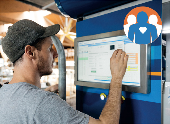 スマートフォン、タブレット、コンピュータといった、あらゆるデバイスから接続可能。ロボット本体に搭載しているタッチスクリーンを通じて、必要とする乳牛データにアクセスできます。 マニュアル搾乳操作も簡単にできるような設計になりました。PC とタッチスクリーンの両方が強力なプロセッサを搭載しており、機能を自動化し、重要なデータにアクセスします。